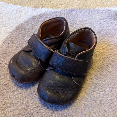 Bisgaard barnesko i størrelse 26 for unisex. Skoene er laget i blått skinn med myk og fleksibel såle. Modellen har borrelåslukking over vristen med stjerne-detalj, og innside i skinn for god komfort. Egnet som innesko for barn. Skinnet er mykt etter en god del bruk og synlig brukt. Ingen hull i skinnet, fortsatt mye bruk igjen og har vært en favoritt her