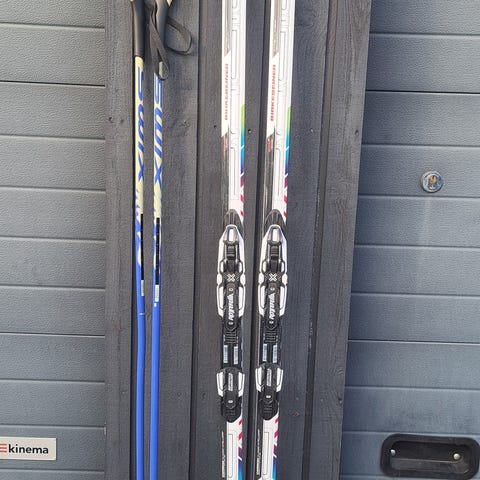 Rossignol R-Skin langrennsski med tilhørende staver. Klassiske felleski med integrert fell under sålen. Skiene har bindingssystem montert. Staver med kork og håndstropp følger med. Egnet til klassisk langrenn på preparerte løyper, men mulig også å gå offpiste. Greit som første langrennski.