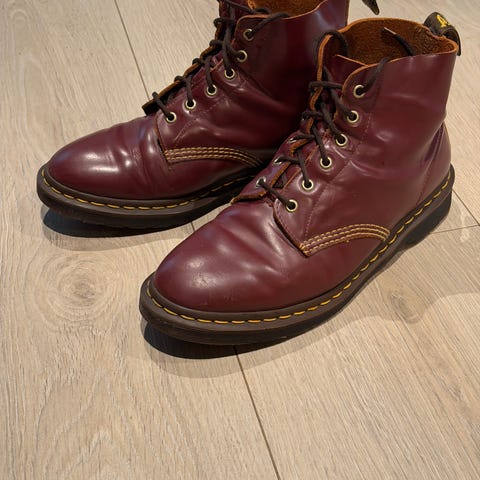 Dr. Martens støvler i størrelse 38. Klassiske snørestøvler i burgunder skinn med karakteristisk gul søm og hempe bak. Overdel i glatt skinn og kraftig gummisåle. Lite brukt.