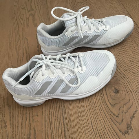 Adidas Ligra hallsko i hvit farge med svarte striper og detaljer. Overdelen består av pustende mesh og syntetisk materiale med snøring foran. Sålen er laget for innendørs bruk med lyst gummi-yttersåle som ikke setter merker. Skoene har polstret hælparti og tunge for økt komfort. Egnet til ulike innendørsidretter og trening på hallgulv.