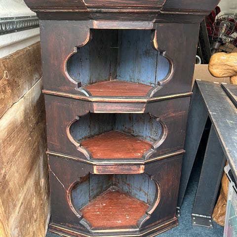 Selger en flott, dekorativ hjørnehylle i bonderomantisk stil. Hyllen er malt i dyp rødfarge med grønne detaljer og har vakre utskjæringer og profiler som gir den et særpreget og nostalgisk uttrykk.