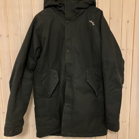 Jakken fremstår som veldig pen og godt holdt. Den har to små flekker på ryggen (se bilder), men disse er minimale og lite synlige. Ellers fremstår jakken som hel og fin uten slitasje, merker eller skader.