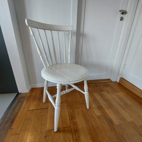 Disse populære pinnestolene selges da vi har fått tak i noen andre og har ikke behov for disse lengre. 2 av de er ikke nymalt men resten er, må kanskje male over en gang til under stolene osv. Den ene stolen har et hakk på den ene spilen