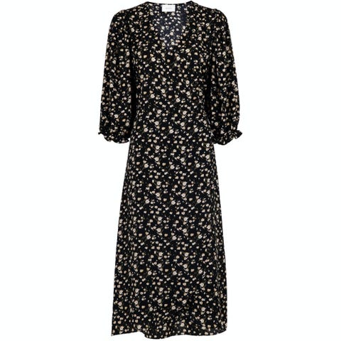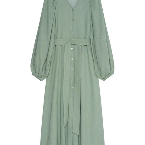 Kjolen er grønn og laget av 100 % viskose. Den har omslagspreget utringning, lange ermer med strikk og et diskret mønster i stoffet.