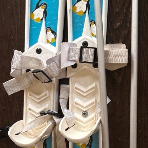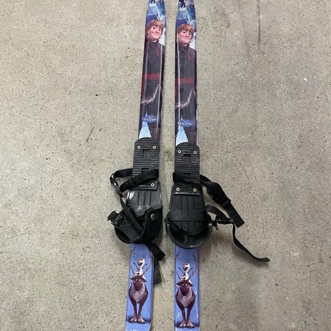 Barneski med staver i hvit og blå farge. Skiene har motiv med isbjørn og snøfnugg. Enkle reimer for feste av sko på skiene. Passer til mindre barn som skal prøve ski eller til lek i snøen.