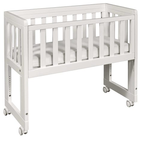 Troll bedside crib barneseng i hvit utførelse. Sengen har sprinkler på alle sider, hvor den ene langsiden kan senkes for plassering inntil voksenseng. Barnesengen står på hjul for enkel forflytning. Egnet som babyseng ved siden av foreldreseng i de første månedene. Laget i treverk med klassisk sprinkeldesign.
