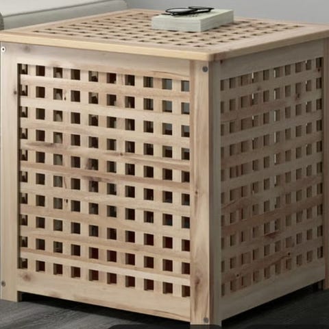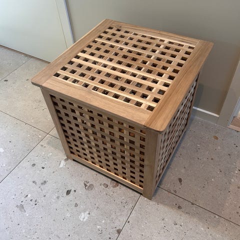 Treverk bord, vaskekurv, utebord selges. Pent brukt, vanlig bruksmerker etter brukt.