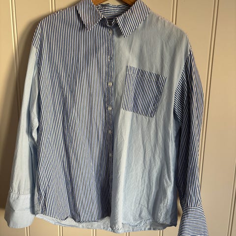 H&M skjorte for dame i størrelse M. Skjorten er blå med hvite striper. Den har lange ermer, klassisk krage, knepping foran og mansjetter med knapper.