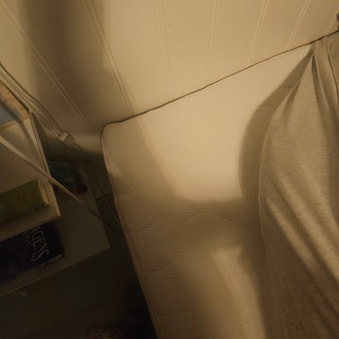 Seng med mål 189x90 gis bort mot henting. Det bilde nr to ser du sengen forfra. Det er litt svettringer på den. Ingen små barn har sovet i den. Første som henter får den.
