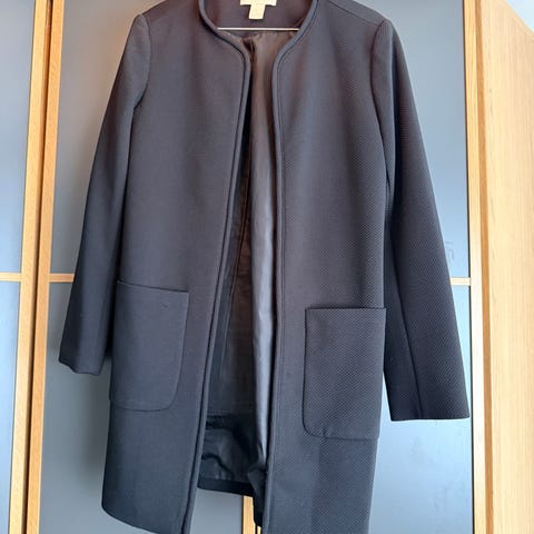 H&M kåpe for dame i størrelse M. Kåpen er svart og laget av polyester. Modellen har et enkelt og rett snitt med lange ermer. Passer som ytterplagg i overgangssesonger eller milde vinterdager.