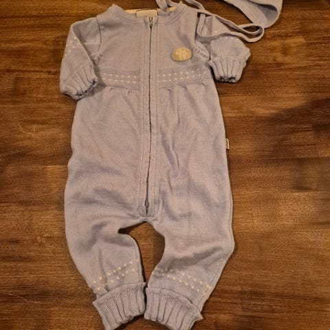 Lillelam sett med dress, lue og sokker. Farge er lys blå. 🩵🧸
