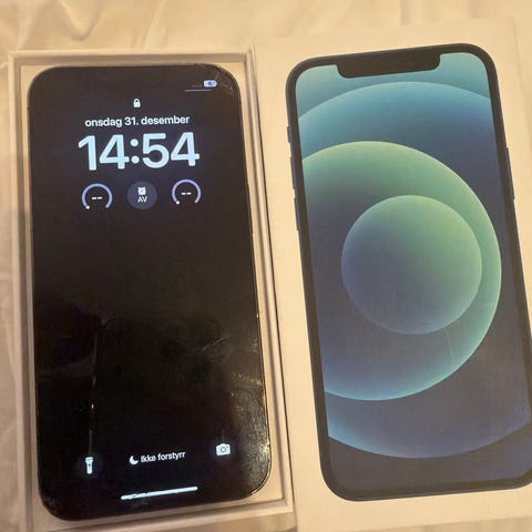 Esken inneholder iPhone 12 mini og dokumentasjon/tilbehør som vist på bildene.
