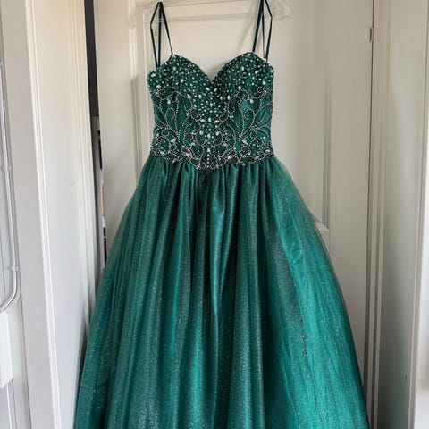 Dette er en drøm av en kjole i en dyp og elegant smaragdgrønn/mørk grønn farge. Den har et nydelig korsett-liv med delikate paljetter og broderier. Skjørtet består av flere lag med tyll som gir et flott volum og en skikkelig prinsessefølelse.