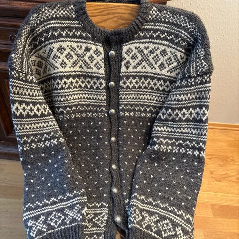 Pen strikkejakke i bomull i fin grønn- og hvitfarge.
