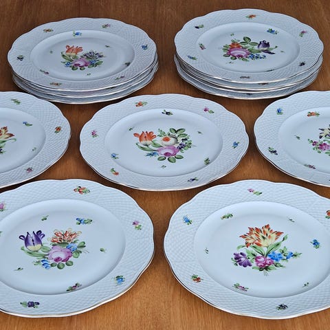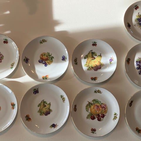 Fruktasjetter og mugge fra Figgjo Flint. Asjetter og mugge har gullkanter og varierende fruktmotiver.