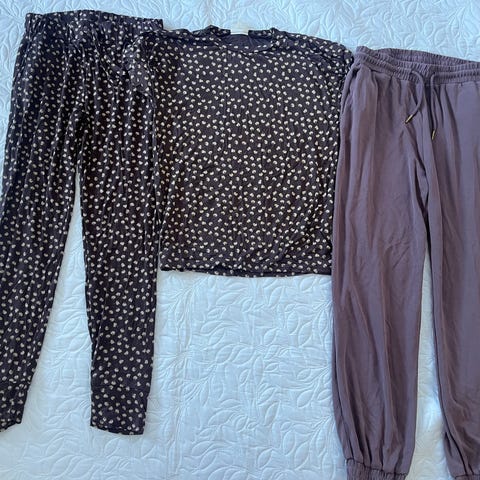 Noen klær er ny med Lapp. En genser er vasket, men mener denne ubrukt. Svart genser er lite brukt, likens shortsen. Blå genser er godt brukt. Legger til en tights som ikke er med på hovedbildet. Tror den så og si er ubrukt. Passer fint til den lilla genseren.