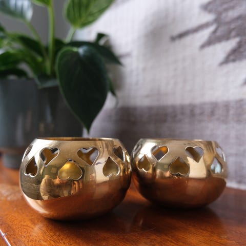 Vintage lysestaker for telys i messing. 5 stykker i tre forskjellige høyder. Har litt patina på seg.