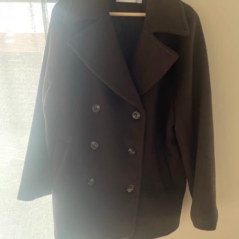 H&M jakke for dame i størrelse M. Jakken er svart og laget i polyester. Modellen har krage med slag, dobbel knepping foran og to frontlommer. Passer som ytterjakke i overgangssesonger og til hverdagsbruk.
