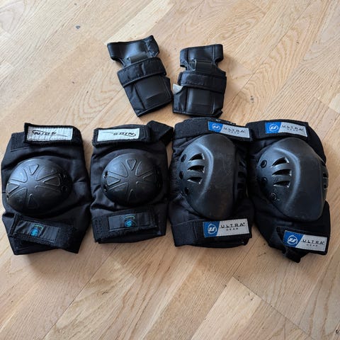 Komplett sett med kne-, albue- og håndleddsbeskyttelse. Beskyttelse av slitesterk nylon, med elastiske stropper for perfekt passform.