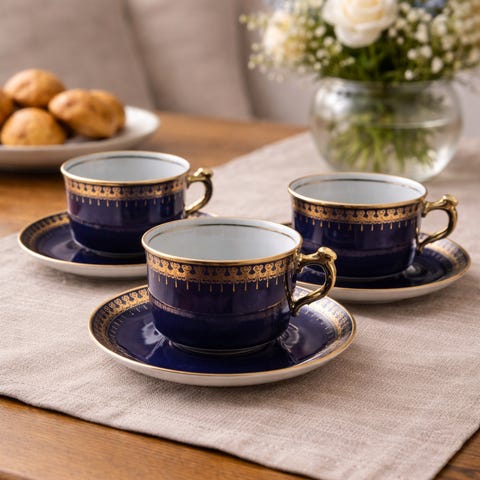 Selger et komplett og dekorativt kaffeservise fra HW Design – Germany Bavaria i sterke blå og gule toner med mønstret kant.