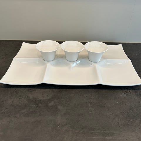 IKEA serveringssett med tre hvite skåler og rektangulært bambusbrett. Kan brukes til servering av tilbehør, snacks, sauser eller småretter.