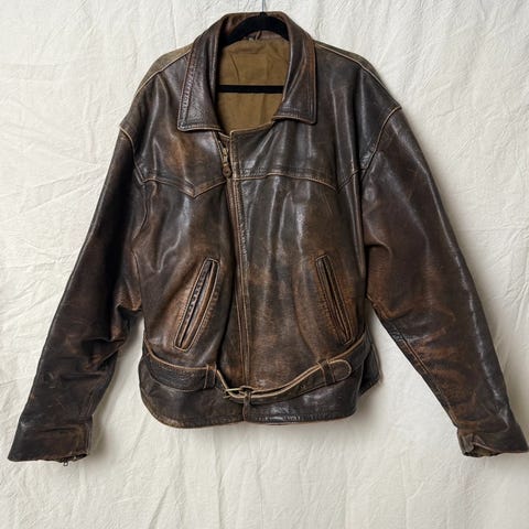 Lufter denne fine skinnjakken for salg da jeg sjelden bruker den. Sjelden moto-jakke fra slutten av 40-tallet / midten av 50-tallet brukt i det italienske militæret. Tykt teksturert geite-skinn og solide Riri zippers. Snittet (minus skuldrene) minner en del om Our legacy mini jacket. Mål: lengde (under krage ned rygg) ca 61cm, armhule til armhule ca 59. Passer S/M