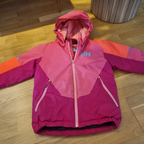 Helly Hansen jakke for barn i størrelse 128 for jente. Jakken er i rosa nyanser med oransje fôr og har hette. Glidelås i front og refleksdetaljer på innsiden ved merking. Snøskjørt. Egnet som ytterjakke til hverdagsbruk og uteaktiviteter. Hel og pen, med unntak av en liten rift nederst bak som fint kan lappes sammen penere enn jeg har gjort:)