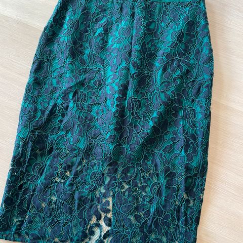 Skjørt fra Samsøe Samsøe i nydelig sjøgrønn farge. Størrelse small. Splitt og flott glidelås bak. 40% bomull, 30% viskose, 30% nylon.