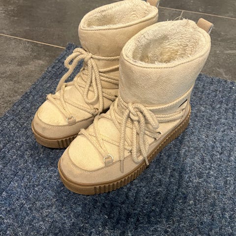 Moon Boot vinterstøvler i størrelse 38. Støvlene er i en lys beige farge med snøring foran og gummisåle. Overdel i tekstil/syntetisk materiale med polstret og isolert konstruksjon som dekker godt oppover ankelen. Egnet som varme vinterstøvler til bruk på kalde dager og i snø. Støvlene er blitt kun brukt noen få ganger på grunn av av at de var litt små i størrelsen, men har fått noe svarte merker på overmateriale og lisser (se vedlagt bilder). Passer til generell vinterbruk og fritid.