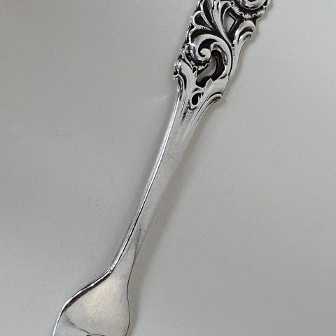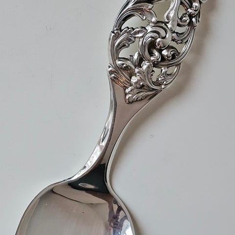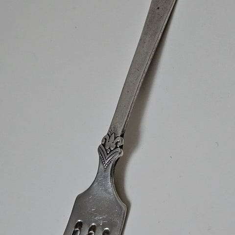 Anretningsgaffel i helseølv i stilen "Elvesæter", kopiert fra treskjæring utført av Rasmus Elvesæter i 1825 og lansert i 1954 av Brødrene Lohne i Kaigaten i Bergen. Originalen henger fremdeles på Elvesæter gård. Dette er anretningsgaffel nr. 341 i serien.