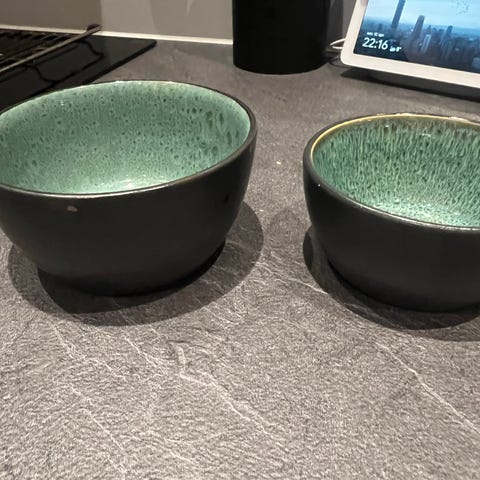 18 store fat, 2lyseblå, 8 brune og 8 blå