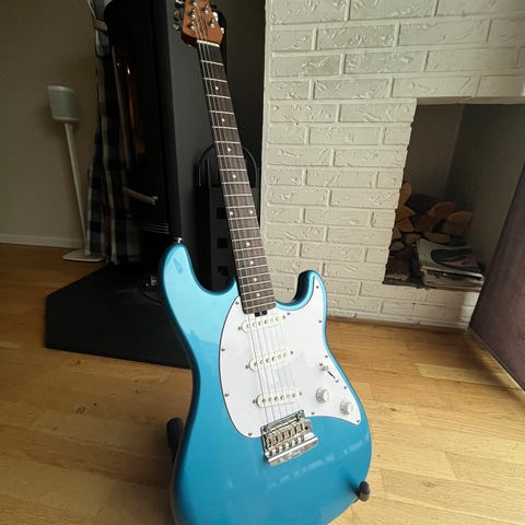 Leveres med skulderreim, og på bildene vises den liggende i en solid tilpasset Gator etui/kasse. Eget bilde av kassen.