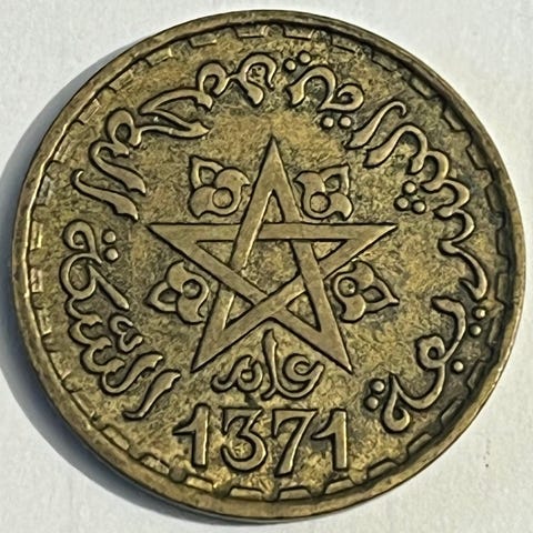 Dette er en 5 dirham mynt fra 1980, preget under kong Hassan II.