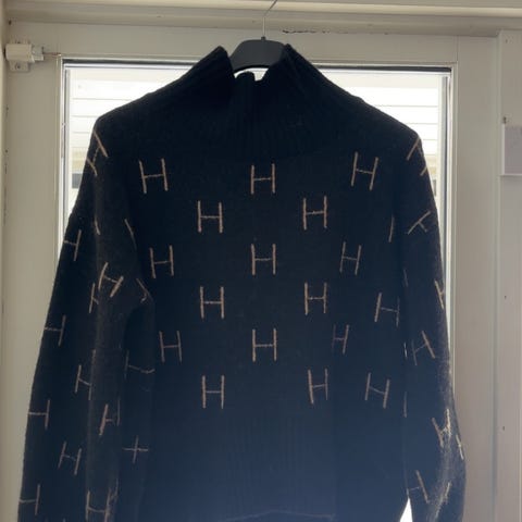 Hest sin bestselgende signaturgenser i str 2. Dette er den korte modellen. Genseren har en høy løs hals, og vide ermer. Sort med beige mønster. Genseren er brukt 2 ganger.
