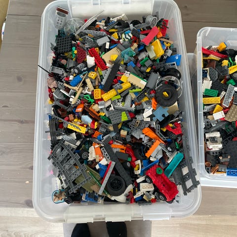 Stor kasse med LEGO blandet klosser og minifigurer selges. Praktisk kasse som kan skyves under seng følger med.