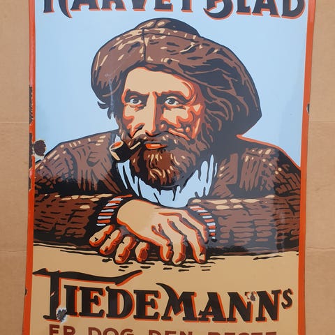 Da rydder jeg videre i samlingen og selger et EMALJESKILT TIEDEMANNS KARVET BLAD . Høyde 65 Cm. Bredde 47,5 Cm og Vekt er hele 2673 Gr. Skiltet er buete og produsert med kun Sjablong Teknikk og er fra 20 Tallet. Dette skiltet er Restaurert - Flikket på der hjørner, delvis rød ytterkant, noe skrift oppe, deler av ansikt, deler av høyre skulder og øvre hånd er over malt . Tenker at Ca. 25 % av skiltet har flikking men er ok gjort og er et fint skilt tenker jeg. Har ikke vært mye rust så alt av metall er meget solid. Fint skilt som er meget blankt så noe glans og skygge på bilder her da.