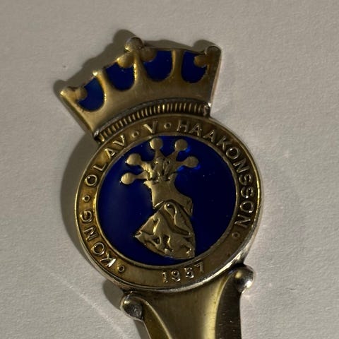 Vintage 17. mai sløyfe i messing fra 1950 / 60-tallet. Kong Olav i solid messing til nasjonaldagen. Sløyfene er 14 cm lange og 2,5 cm brede. Selges for kr 300. Kan hentes i Asker/Oslo