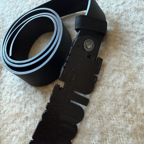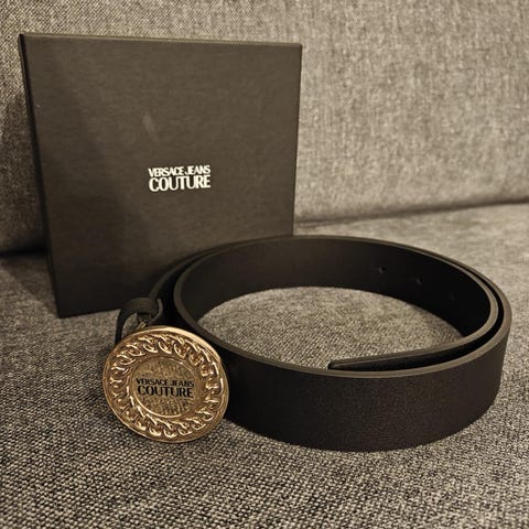 Versace belte unisex i svart farge med gullfarget spenne. Beltet har en dekorativ spenne med karakteristisk motiv i metall. Reimen er i glatt materiale med preget Versace-logo på innsiden. Passer til bruk i bukser eller som tilbehør i hverdagsantrekk og mer formelle anledninger. Unisex-modell som kan brukes av ulike størrelser avhengig av hulljustering.