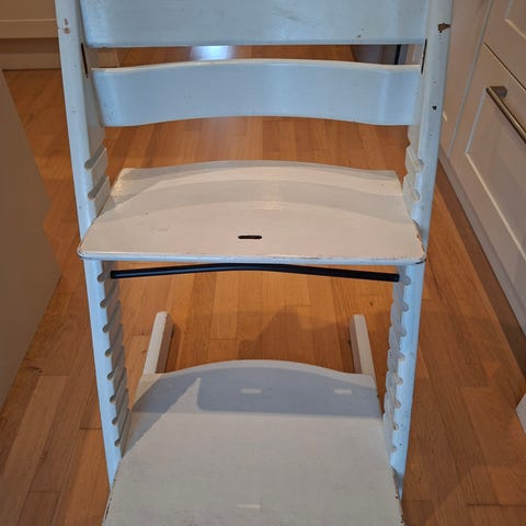 Stokke Tripp Trapp høy barnestol i hvitlakkert tre. Stolen har justerbart sete og fotbrett som kan flyttes i høyden etter barnets størrelse. Klassisk design som kan brukes over lang tid.
