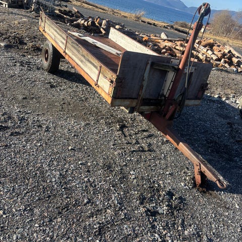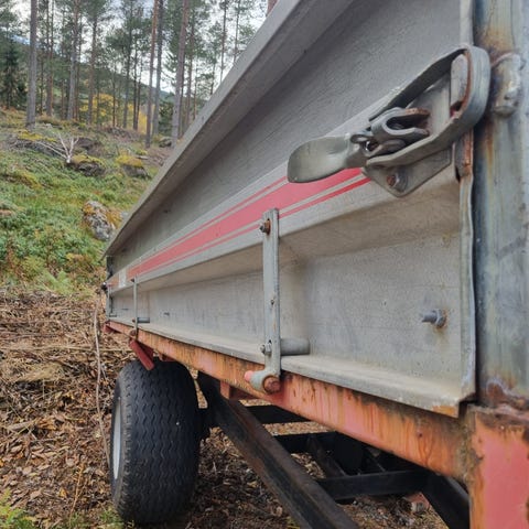 Selger traktor hengeren da traktoren skal selges. Er ett manuelt utskyt på enden av krana som ikke er dratt ut på bilder.