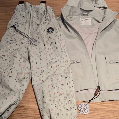 Vårdress i to deler med jakke og bukse. Godt brukt med synlige bruksmerker, men uten hull og har mye bruk igjen. Alle glidelåser fungerer. Den ene stroppen til å ha under skoen er dessverre borte. Skalljakke og bukse med fleece innvendig.
