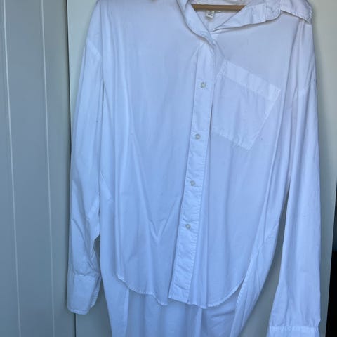 H&M skjorte for dame i størrelse L. Klassisk hvit skjorte med krage, knappelukking foran og brystlomme. Laget av 100 % bomull ifølge vaskelappen. Langermet modell med enkel, rett passform. Egnet til både hverdag og mer formelle anledninger. Vaskes i maskin etter anvisning på plagget.