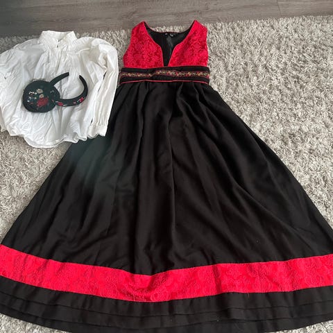 Settet består av svart cape med metallspenner, hvit skjorte med krage og broderte detaljer, samt svart og rød stakk/kjole. Fargene er flerfarget med hovedfarger svart, hvit og rød. Passer til bruk ved høytider, 17. mai og andre anledninger der bunadsinspirert antrekk ønskes.