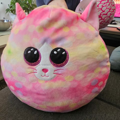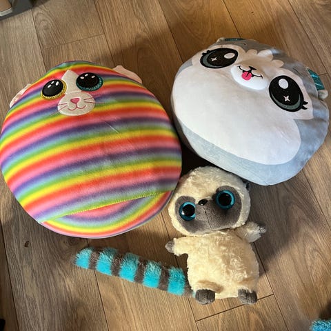 Selger to kattekosedyr av typen squishmallow. En liten og en stor (enhjørning-katt). Selges samlet for 100 kroner. Pent brukt, men kan sikkert ha bruk for en vask.