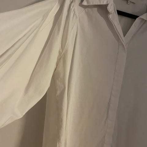Katrin Uri skjorte for dame i størrelse 36. Skjorten er hvit og i deilig kvalitet (97% bomull, 3% spandex). Den har lange ermer og krage, og en original detalj foran med en «splitt» som holdes sammen. Klassisk skjorte-fasong bak. Nydelig skjorte som passer til det meste.