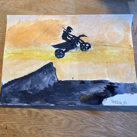 Akvarellmaleri på papir med abstrakt motiv i svarte, oransje og røde toner. Bildet viser en mørk form mot venstre side og en figur med hjulformet element mot høyre, satt mot en flerfarget bakgrunn. Egnet som veggdekorasjon i hjem eller kontor. Kunstner og eksakt størrelse er ikke oppgitt.