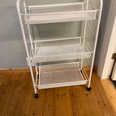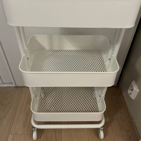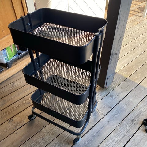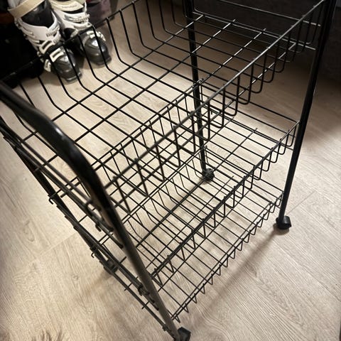 Oppbevaringsvogn i metall med hjul i svart farge. Vognen har to trådhyller og leveres med flere hvite plastbokser/beholdere som kan henges på siden eller plasseres i hyllene. Egner seg til oppbevaring av småting på kjøkken, bad, kontor eller barnerom. Den passer godt som ‘amme’-tralle. Vognen er smal og lett å flytte på takket være hjulene. Passer godt der det er behov for ekstra oppbevaringsplass på liten flate.
