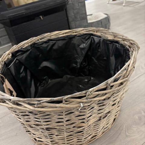 Kurv i flettet rotting med hank. Kurven har innvendig plast som gjør den egnet til oppbevaring eller som plantekurv.