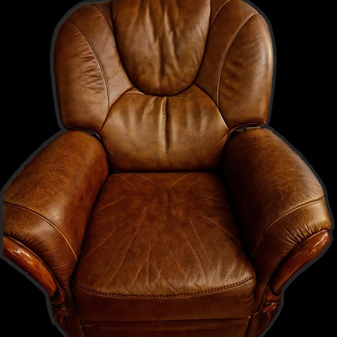 Selger to komfortable lenestoler i skinn med tilhørende puff/skammel.