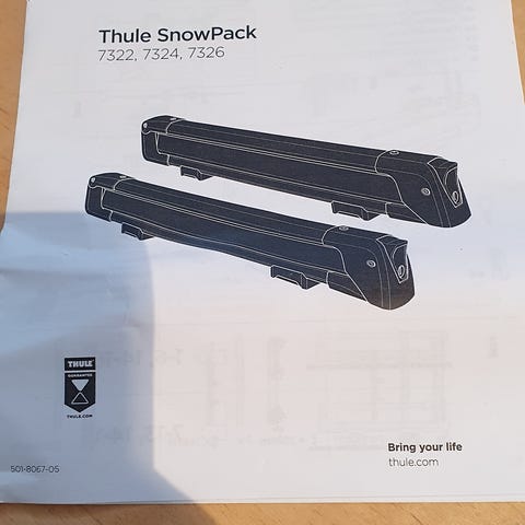 Instruksjonshefte følger med, sammen med tilhørende plast- og gummideler for feste og justering på bilen. Egnet for kjøretøy som er kompatible med Thule WingBar Edge 958X-systemet; se Thules kompatibilitetsguide for korrekt tilpasning til bilmodell.